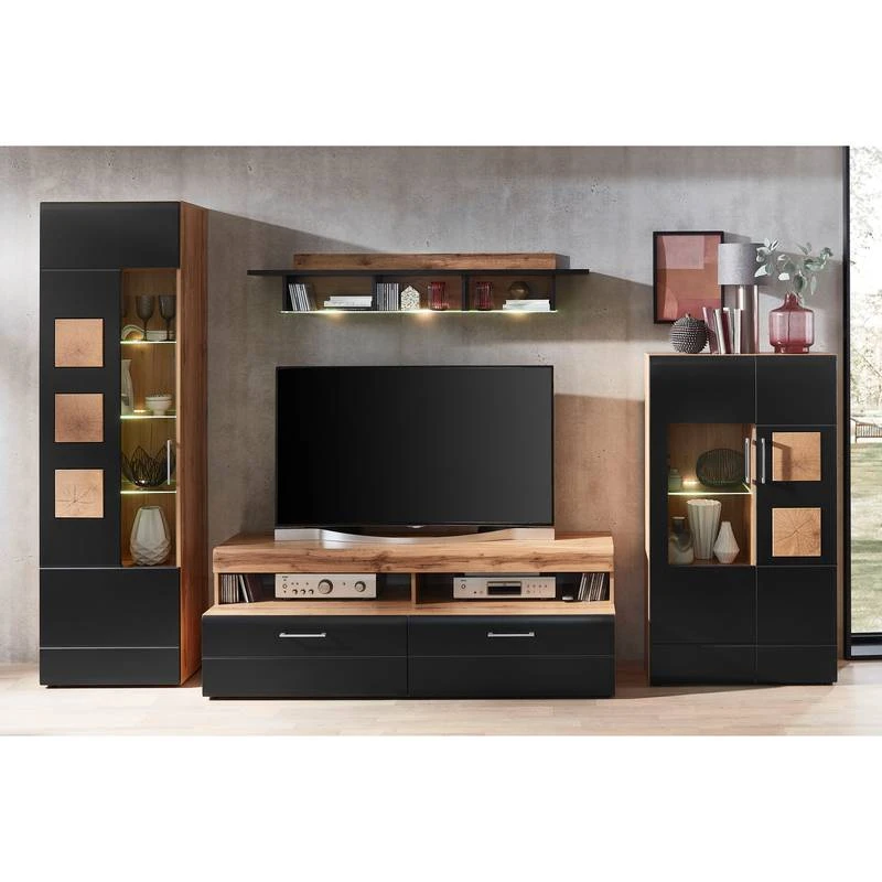 - Contenu de la livraison : Ensemble comprenant 1 vitrine, 1 tablette murale, 1 meuble TV et 1 buffet haut, avec éclairage et sans accessoires