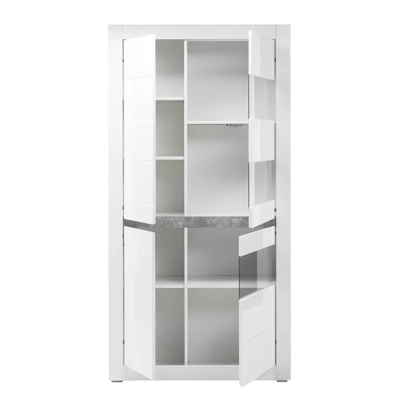 - Contenu de la livraison : Ensemble comprenant 1 vitrine, 1 tablette murale, 1 meuble TV et 1 commode, sans éclairage ni accessoires